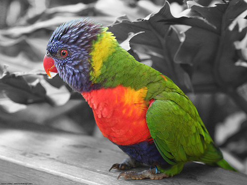The different species of lovebird are identifiable by their colors and markings. They vary greatly in their coloring, and each species can be viewed for their unique combinations. Younger birds are duller in color and they have black in their beaks. The young birds coloring intensifies as they reach maturity. Regardless of the species, mature lovebirds are gorgeous parrots!